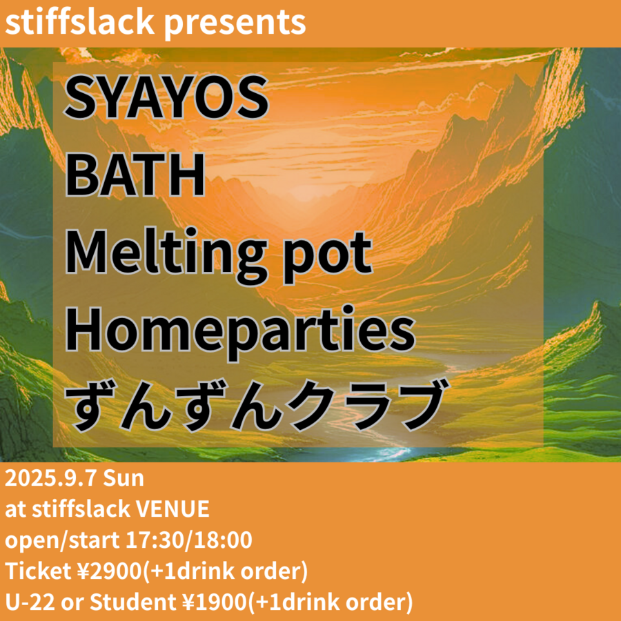 8月にセルフプロデュース/セルフRECにて異形の1st フルアルバム"Anthem 1.1"を発表したばかりのSYAYOSが早速SSに帰還!!!!ツインギター、ベース、ドラムという最もポピュラーな編成でアウトプットするそのギターロックサウンドはポストロック/ポストパンク/インディーポップを現代的な雑食性と折衷性とアイデアとポップネスにてアップデートしまくるネクストブレイク筆頭バンドです。そんな彼らの対バンには東海圏の猛者が集結、三重の至宝で異形のインディロック"BATH"、SSではEmitationでお馴染みサカイショウイチ率いるMelting pot、かなり久々ですんません名古屋のグッドメロディ/グッドソング量産インディロックバンド"Homeparties"に天才変態音楽集団名古屋のスーパーオーガニズムこと"ずんずんクラブ"という