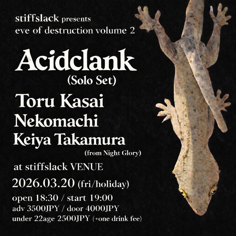 モジュラーシンセ奏者の Yota Mori による ソロプロジェクト"Acidclank"のソロセット。 モジュラーシンセサイザーを中心とした機材を自在に操り、 その場で音を構築していく即興性の高いライブパフォーマンス。 IDMやテクノ、ブレイクビーツを軸にしながらも、 楽曲は固定されず、 空間や時間の流れに呼応して有機的に変化していく。 一人でありながら多層的でダイナミックなサウンドスケープを生み 出す、実験性とグルーヴが共存したエレクトロニック・ライブ。